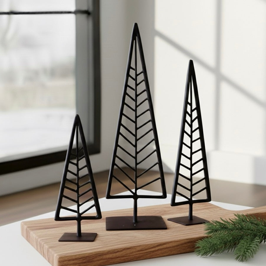 Open design, black metal tree. Adds height and a modern look to your Christmas display