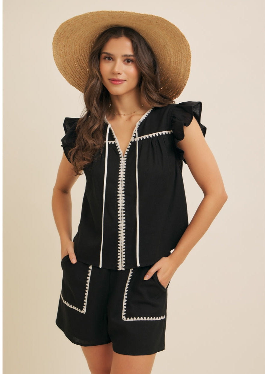 This simple split neck blouse features a delicate contrast embroidery and can be dressed up or down.