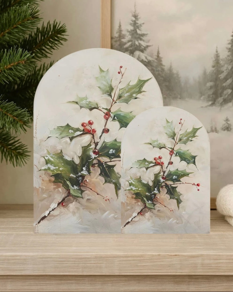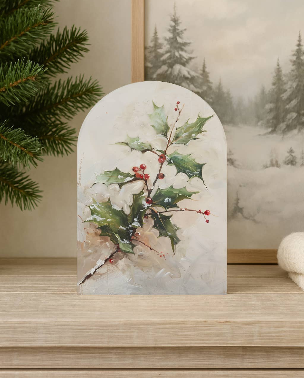 Enhance your holiday decor with our Holly Branch Arch. This printed arch adds a touch of winter to any display, and its thin design is perfect for layering. Welcome the winter season with this versatile and stylish addition to your home.