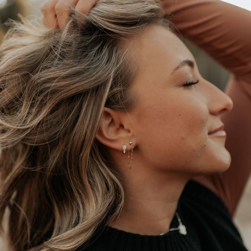 Worn like a stud with the appearance of a chain huggie. Perfectly secure for whatever the occasion!