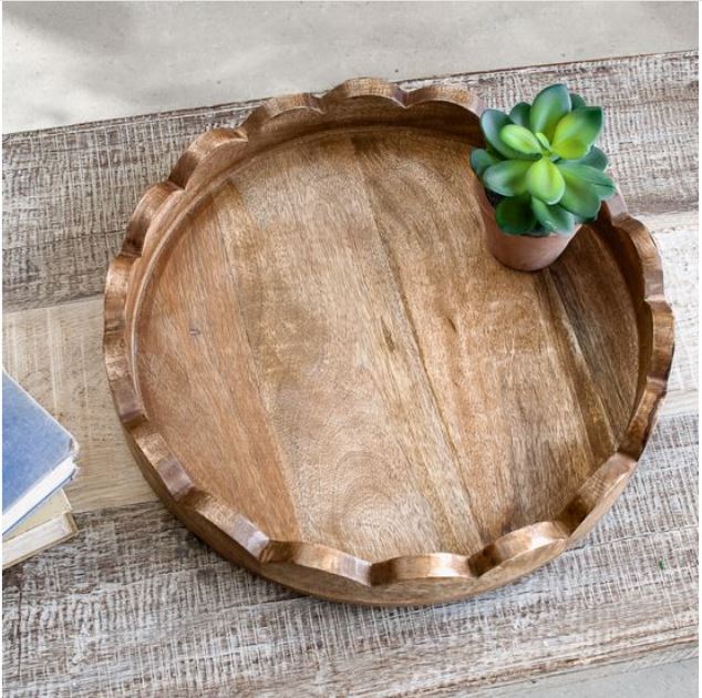 This round wood tray features a delicate scalloped edge design that adds charm to any space. Made from sturdy wood, it’s perfect for serving snacks, organizing small items, or adding a decorative touch to your home.