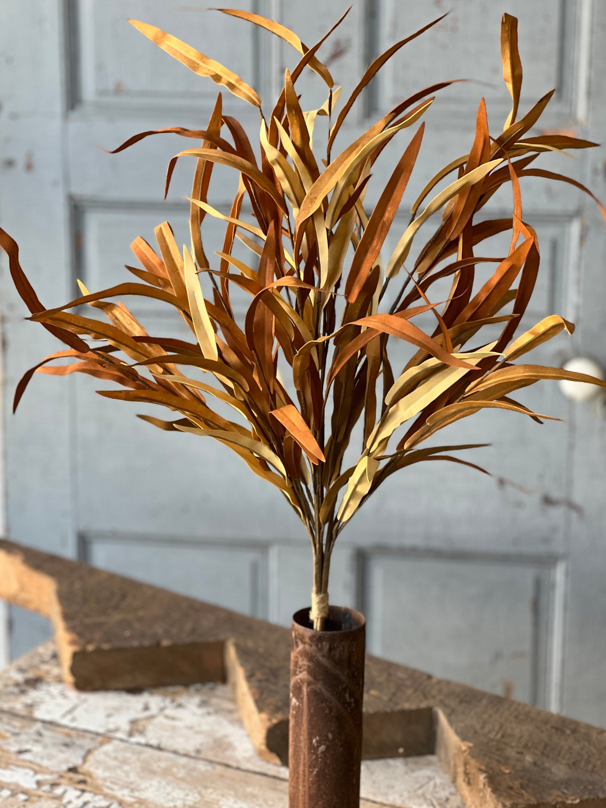 Stems of faux grass-like foliage in a mix of warm autumn colors. Bundle includes 3 large stems