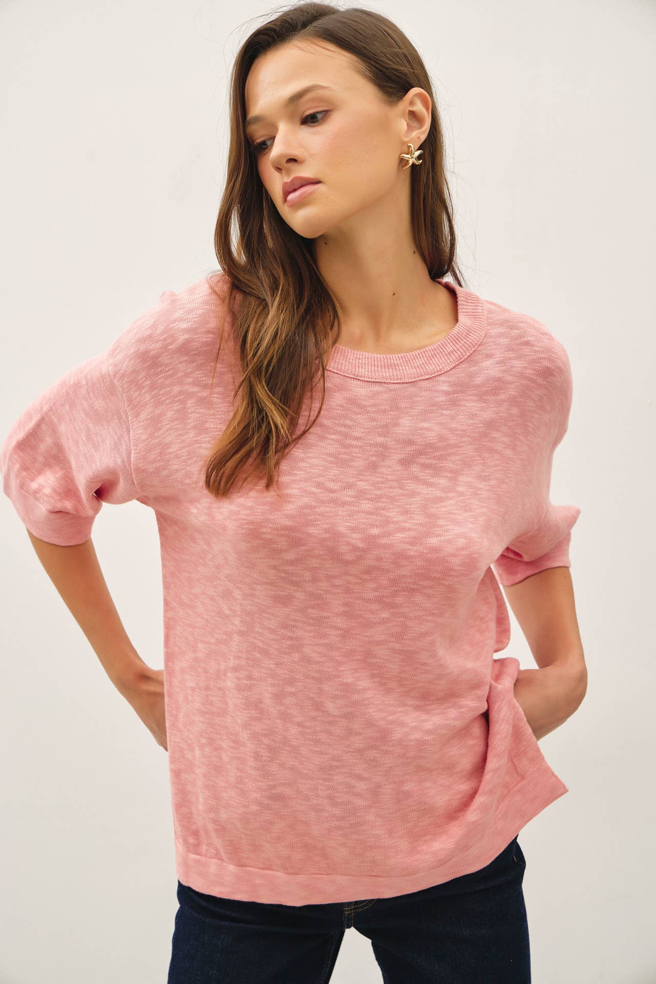 * PULLOVER SWEATER * SHORT SLEEVE * DROP SHOULDER * CREW NECKLINE * COTTON SLUB YARN * SLITS ON SIDE HEMLINE * RELAXED, COMFORTABLE FIT
