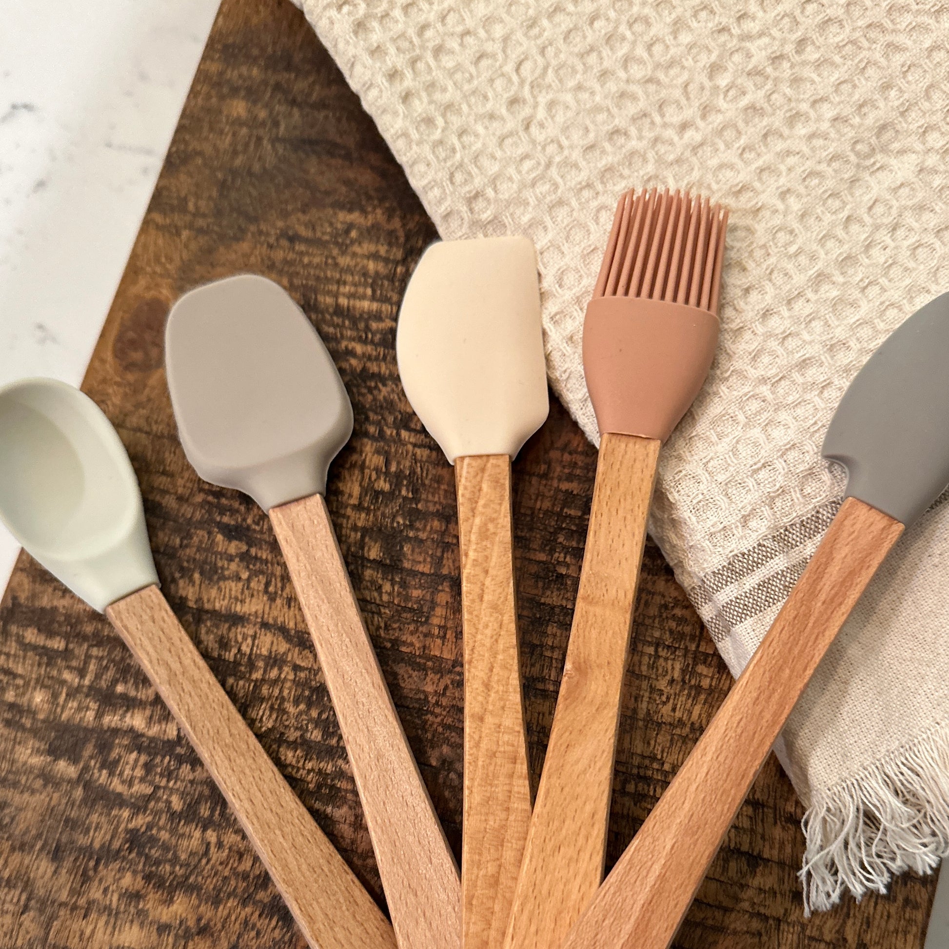 This five-piece utensil set is thoughtfully crafted with a bamboo handle and a silicone head, offering a balance of durability and gentle flexibility. The neutral color palette goes well with many decor styles